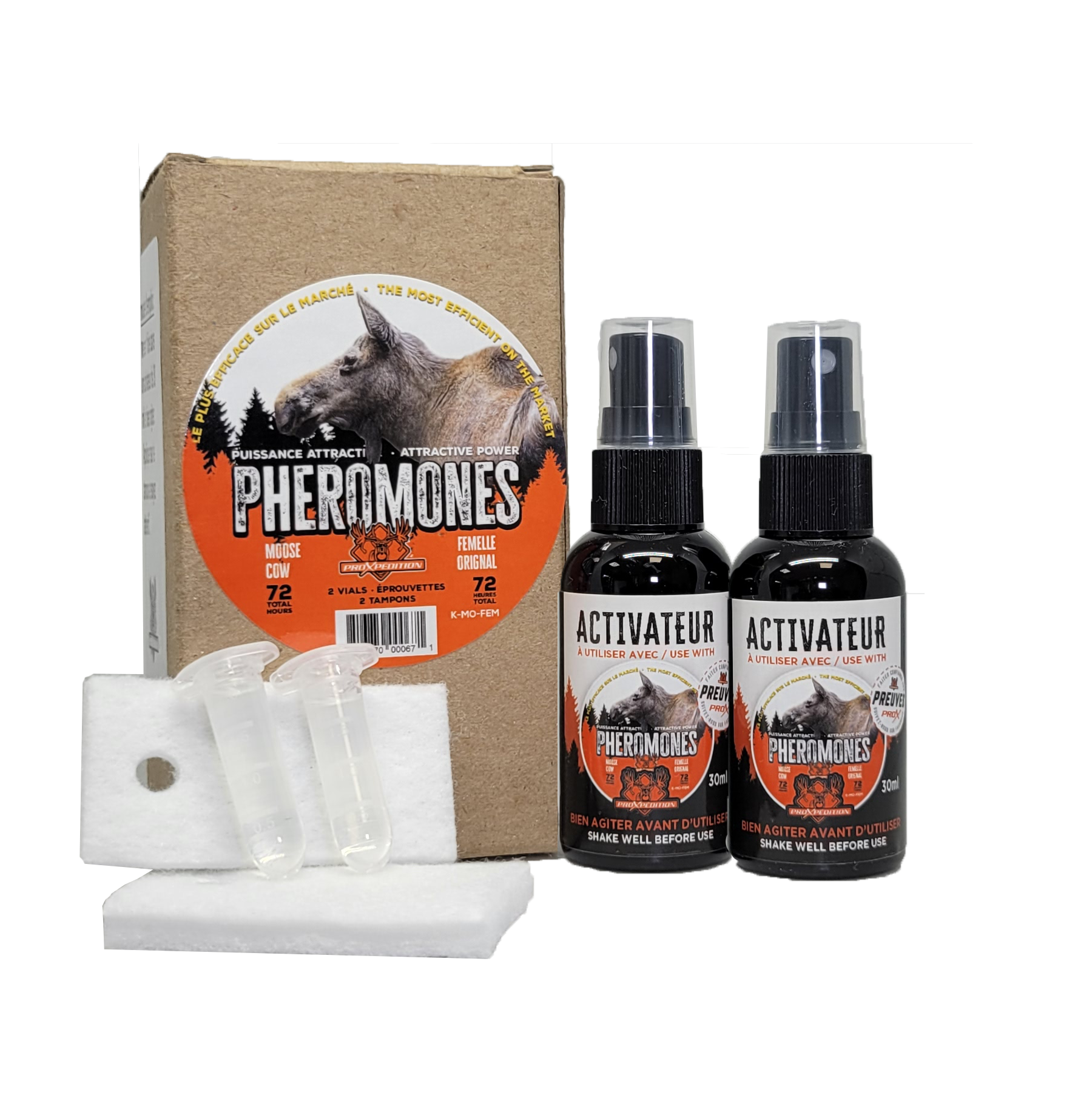 Suscitez la curiosité de nombreux orignaux grâce à nos phéromones de femelle orignal. Les phéromones sont des substances chimiques émises par un animal, suscitent d’importantes réactions chez les autres animaux. Cet outil indique aux orignaux la présence d’une femelle sur leur territoire et les encourage à visiter votre territoire de chasse. Ce produit n'indique pas que la femelle est en chaleur, seulement qu'elle est présente. Les phéromones de Proxpédition ont une grande puissance attractive. Les résultats que vous obtiendrez vous convaincront d'utiliser nos phéromones dans toutes vos sorties de chasse. Les tests en laboratoire montrent que l’odeur est présente à 100% pendant les 36 premières heures et diminue rapidement par la suite. Un emballage de Phéromones d'orignal femelle contient 2 éprouvettes de phéromones, 2 activateurs et 2 tampons. Tout y est pour augmenter la quantité d'orignaux là où vous avez choisi de les attirer. Mode d’emploi : Il suffit de verser une éprouvette dans un activateur et de bien mélanger. Ensuite, on verse le mélange sur un tampon et on le dépose à l’endroit où l’on souhaite voir le gibier. Vous verrez que ce sont les phéromones les plus efficaces du marché!