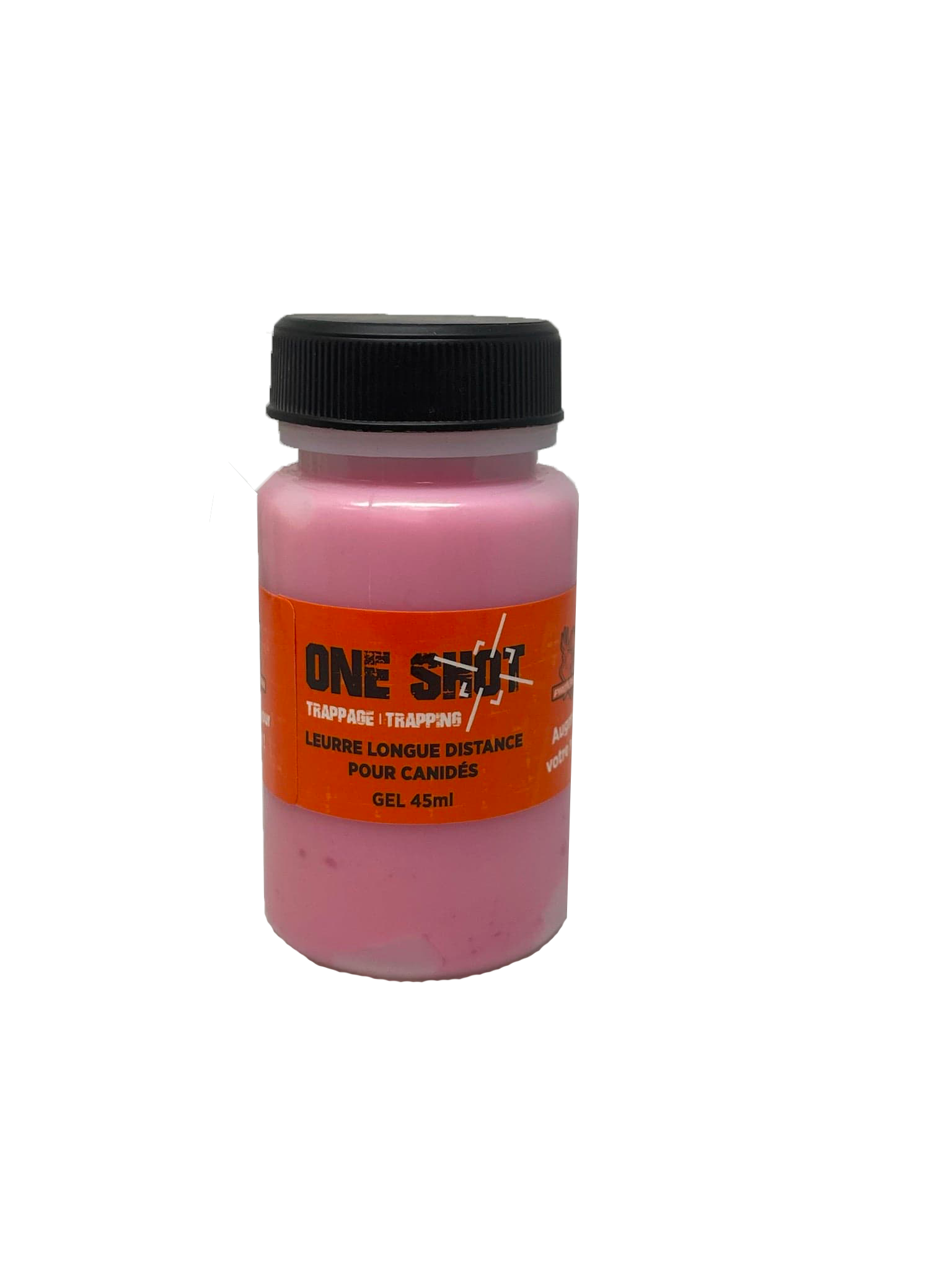 Procurez-vous ce leurre efficace pour améliorer votre expérience de trappage. One-shot est une pâte rouge qui ne gèle pas conçue pour les trappeurs de canidés. Sa forte odeur de mouffette et son mélange de glandes ont fait leurs preuves avec les canidés. Utilisez-le lors de la pose de trappe ou à la chasse à l'affut des coyotes ou des loups. Produit offert en format de 60 ml avec un pinceau applicateur facile à utiliser.